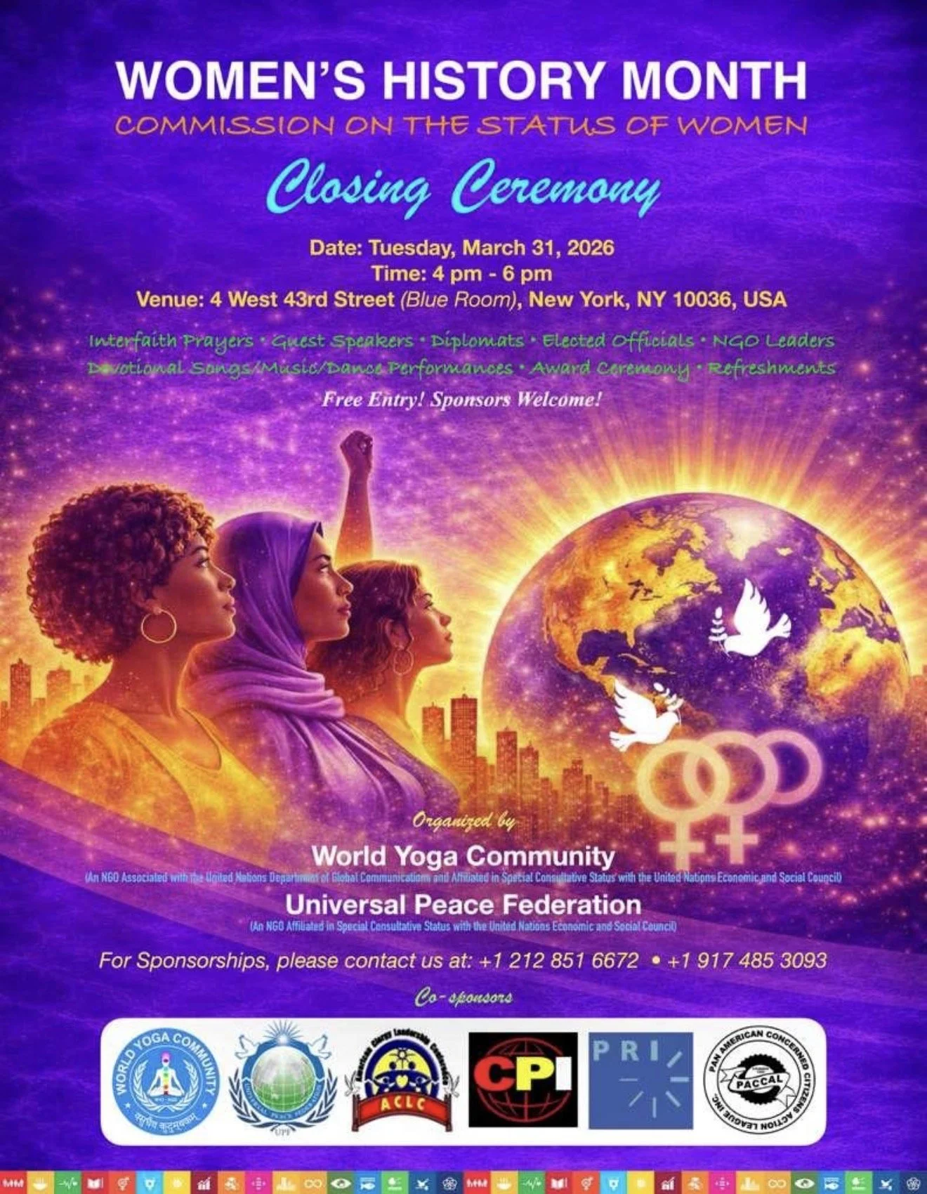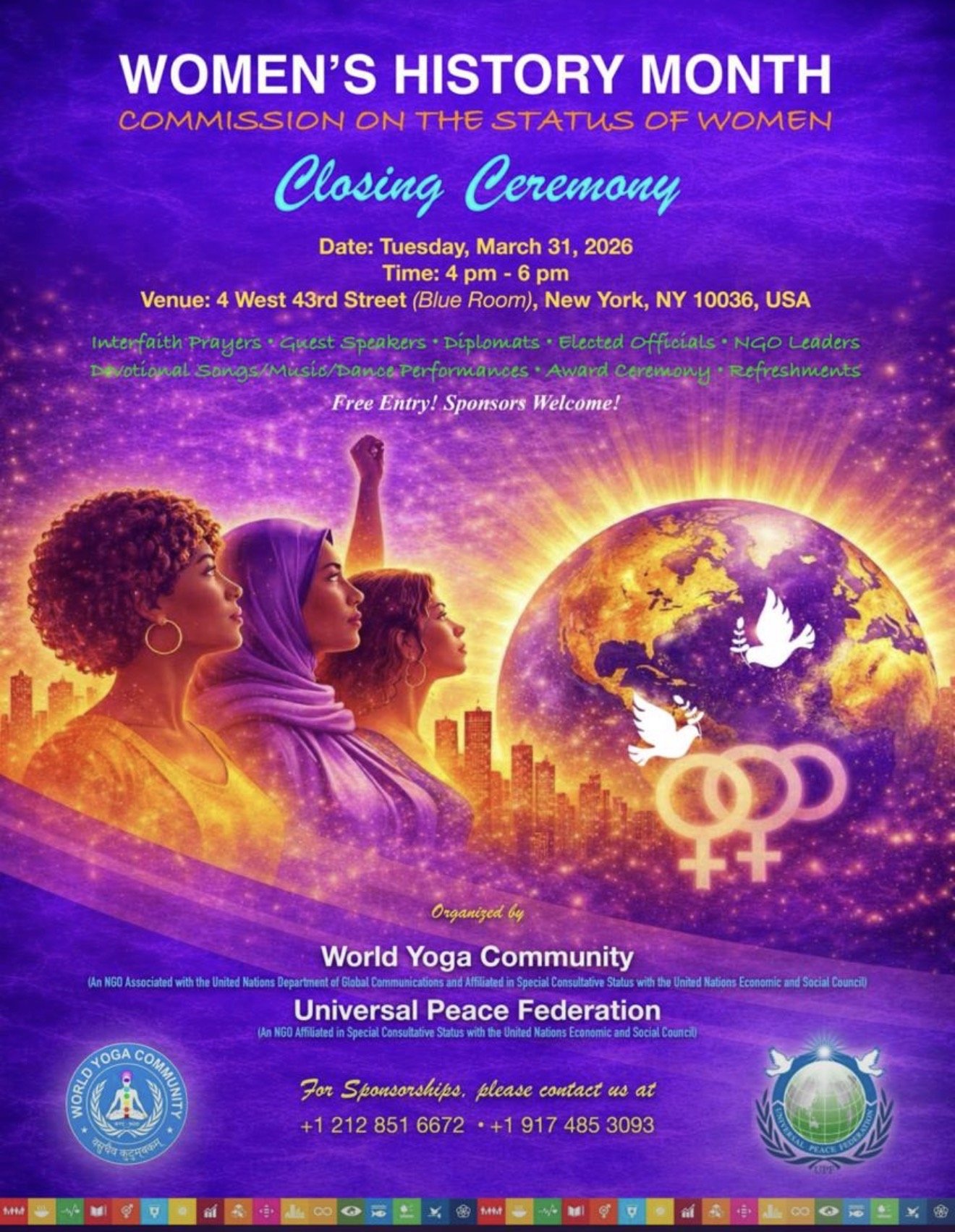 The World Yoga Community, Policy Research International, Youth and Students for Peace International, the Universal Peace Federation, the World Assembly of Youth of the United Nations, the International Federation for Women in Legal Careers, the American Medical Women’s Association, the International Day of Yoga Committee, and the Pan African International Agency on Water and Sanitation for Africa to the United Nations, among other organizations, all participated.