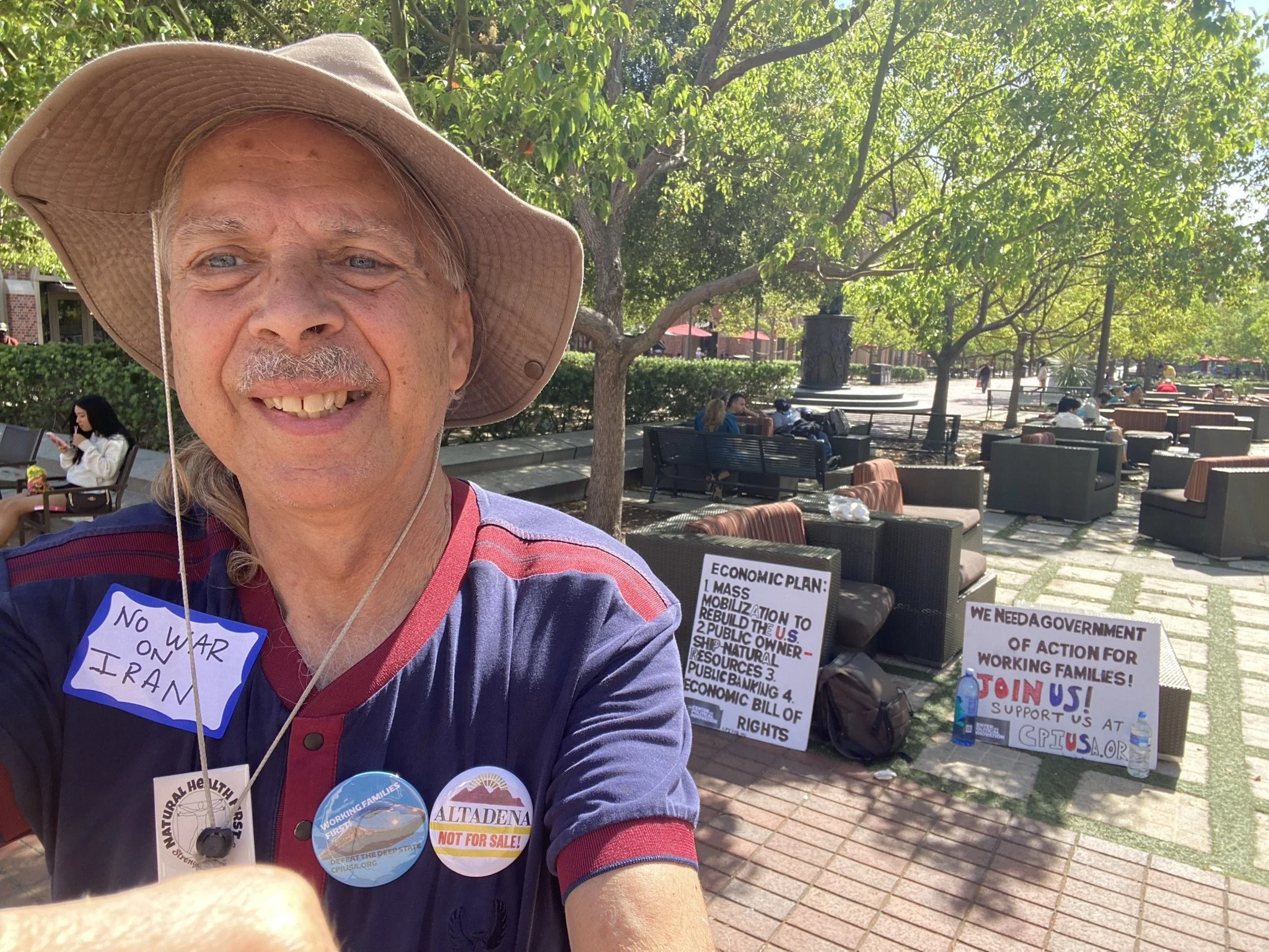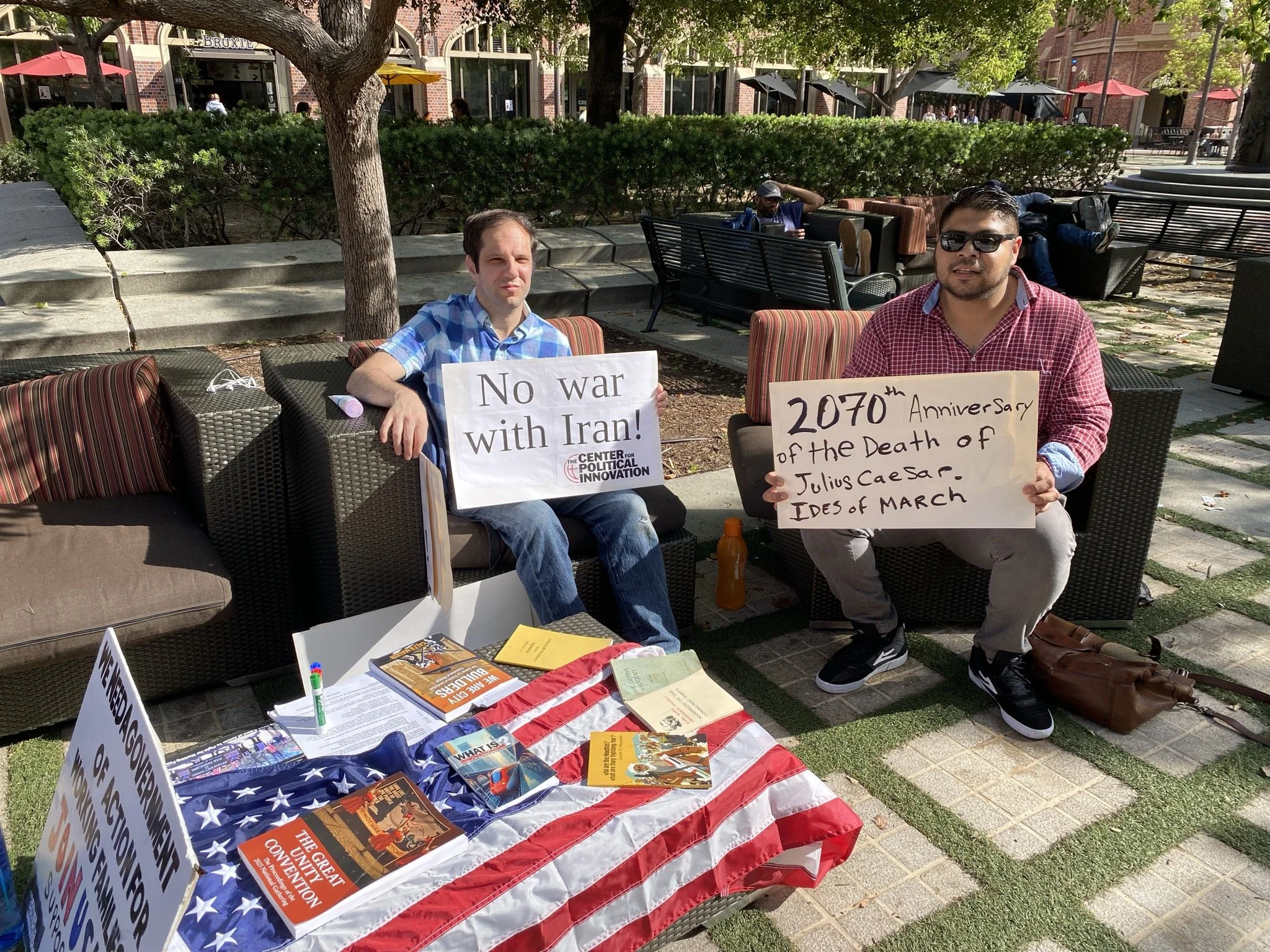 In Los Angeles, CPI members marked the occasion with outreach near the University of Southern California campus, south of downtown. The group set up an outdoor table displaying CPI literature, including What Is Innovationism? and We Are City Builders, alongside signs reading “No War With Iran” and “Stop the Illegal Embargo of Cuba.”