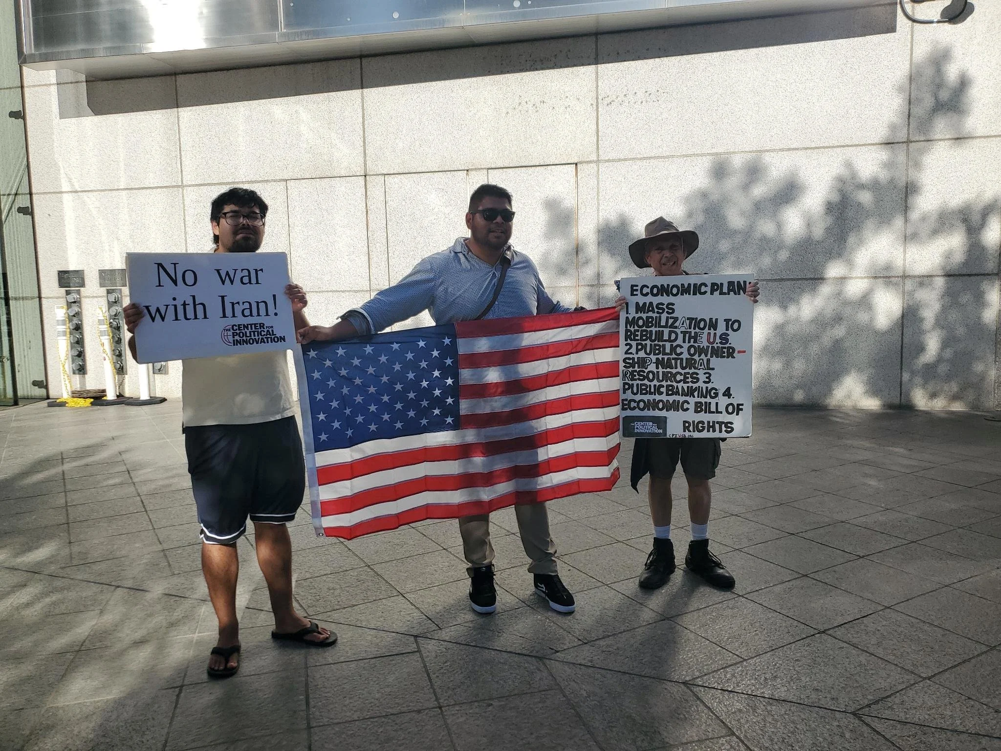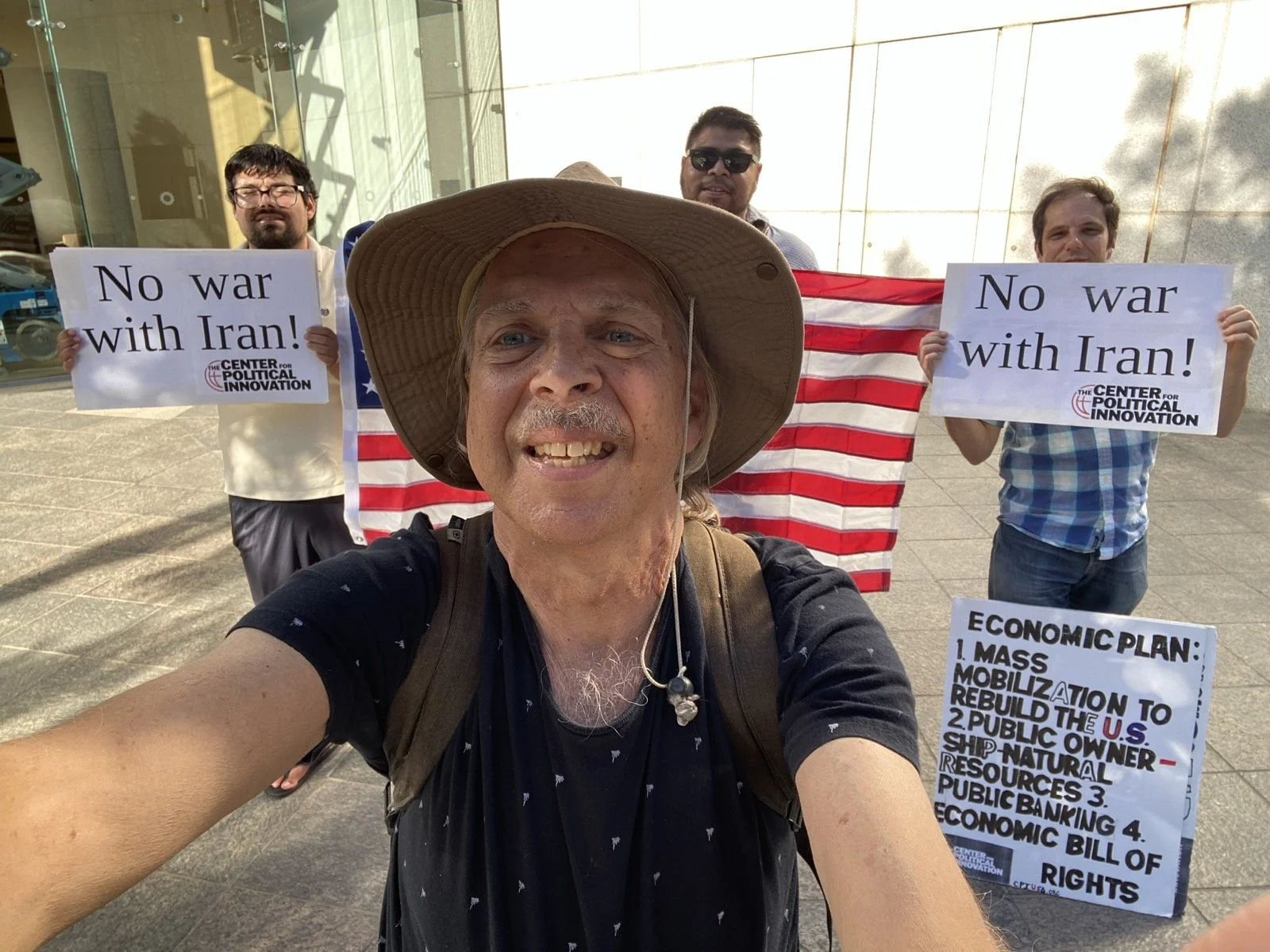 Carrying our signs displaying evergreen economic messages and our anti-war signs, we then crossed the street to go on the other side to walk passed more historical sites and hundreds of tourists alone. We ended up at a spot on the public sidewalk and had conversations with people from all around the country including Alabama, Oregon and were even approached by a family from Minnesota that wanted to take a picture with us and our anti- war signs and U.S. flag. There was a former veteran and disillusioned Trump supporter and other locals connecting with us and as usual many people read something on at least one of our signs.