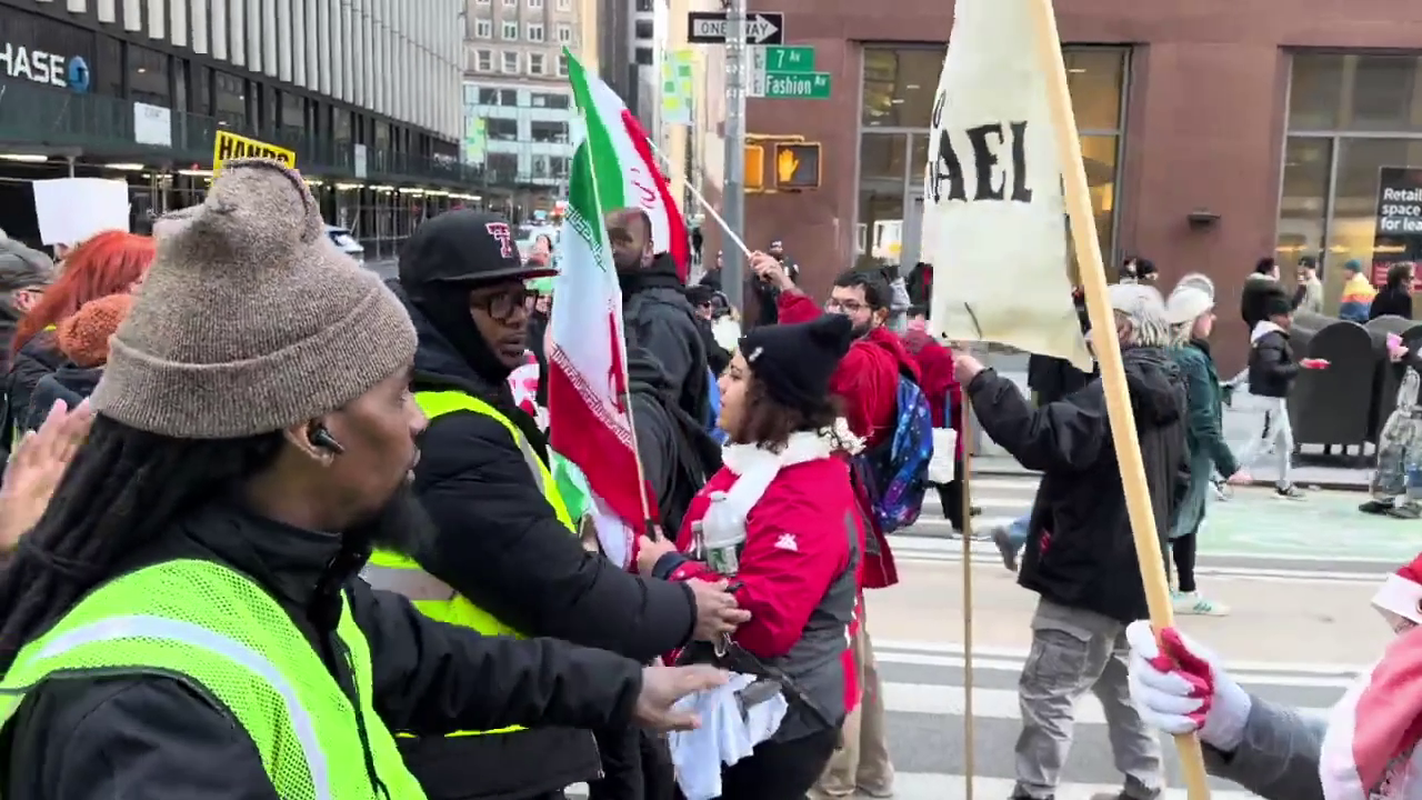 At the pre-march rally organized by some Reformed Jewish synagogues and liberal NGOs at Columbus Circle, CPI members crashed the event, loudly blasting our message. Then organizers rushed downtown and formed a human chain at 7th Avenue and 38th Street. With Iranian and American flags, placards, and a large banner, along with bullhorns and a portable sound system, CPI held the line against Democrat marshals who tried to clear the street, ramming CPI activist Noah Shenk with their bicycles, shoving activists, and otherwise trying to clear the way for the woke, Democratic parade of deception.