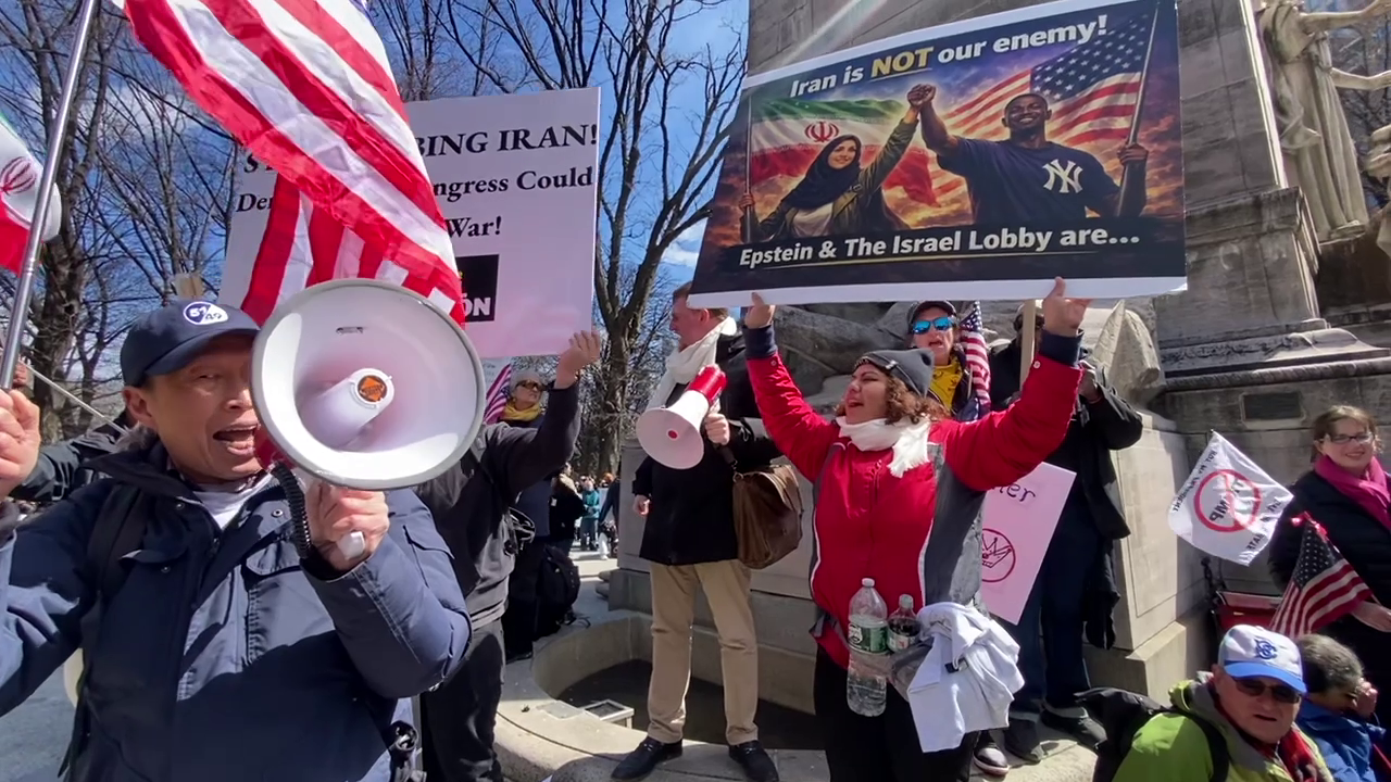 This was all caused and created not just because of Trump and Netanyahu, but because of the Epstein class. They’re focusing so much on Trump—they have all these caricatures of him: ‘Trump is bad.’ Clearly, he’s like the main—he’s a misguided president, he’s following. But who’s driving it? What’s the driving force? Because the whole point of this is that this is a war against working people here, and a war against working people in Iran. So it hurts both Americans and Iranians. And it’s just great that I’m holding the Iranian flag, and you have the American flag also. We also have the American flag too, because the countries are not supposed—the people don’t support this war.”